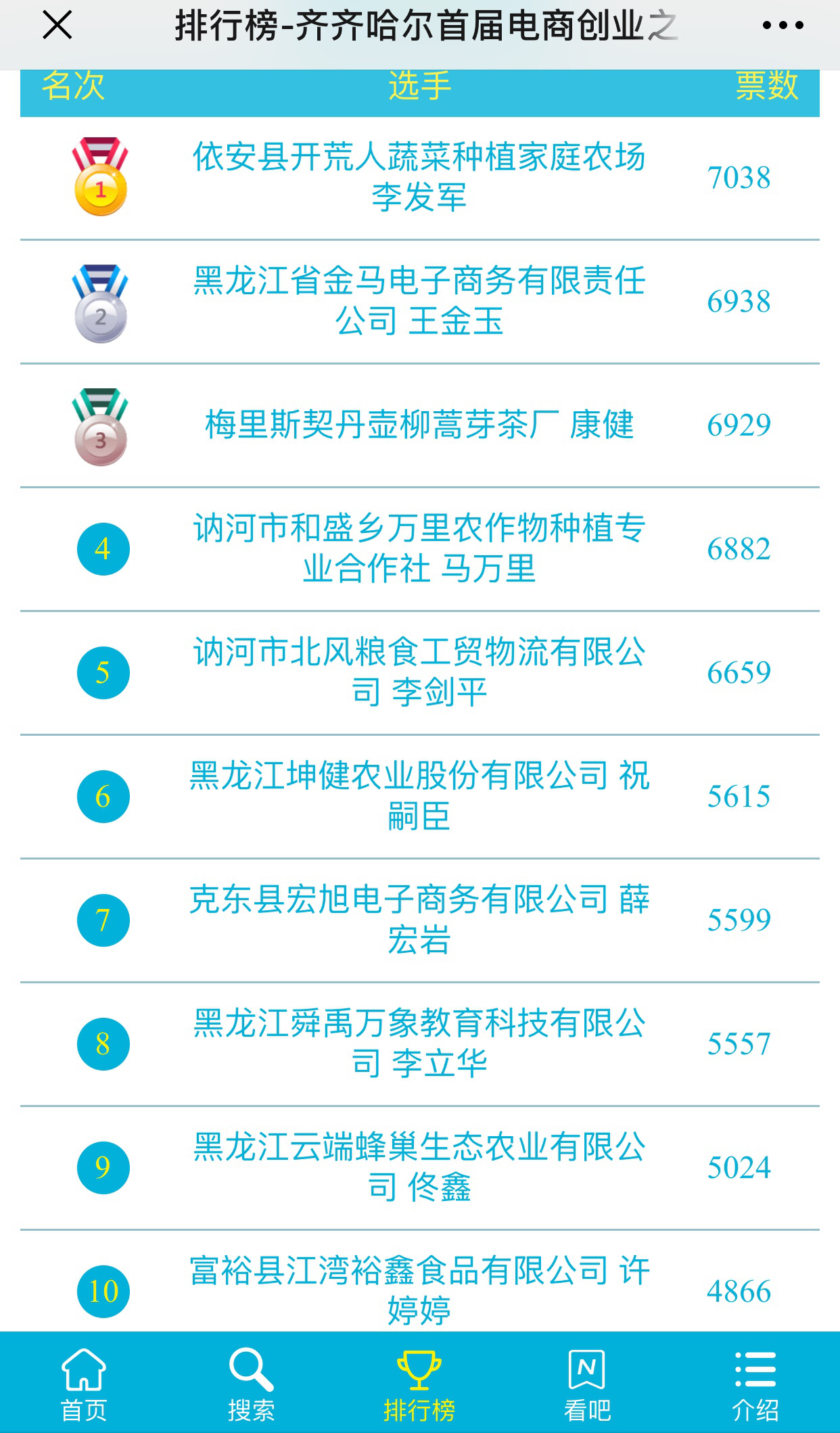 此次电商创业之星评选活动于6月18日-23日通过各县(市)区电商主管部门、电商办推荐,企业自行上报等形式进行申报,并于7月2日-4日通过第三方投票系统评选出了前十名为齐齐哈尔“首届电商创业之星”获奖者。
