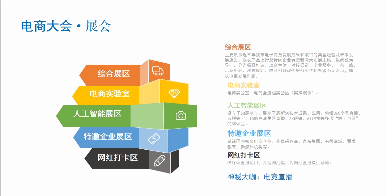 从内容上,本次大会采取“1+4”的展现形式,即1个电子商务成果展和4个主题论坛。成果展位于齐齐哈尔国际会展中心A厅,占地面积6000平米,主要分为综合主展区(405㎡)、县区特装展(108㎡/个)、电商实验室(134㎡)、人工智能体验区(134㎡)、特邀企业展区(54㎡)、网红打卡区(54㎡)电竞直播(100㎡)7个部分,共设置展位100余个。主题论坛板块设置了智能科技赋能农产品上行、数字化转型助力县域经济高质量发展、新零售、新媒体、新电商促转型、互联网+人才培养等四个主题论坛。