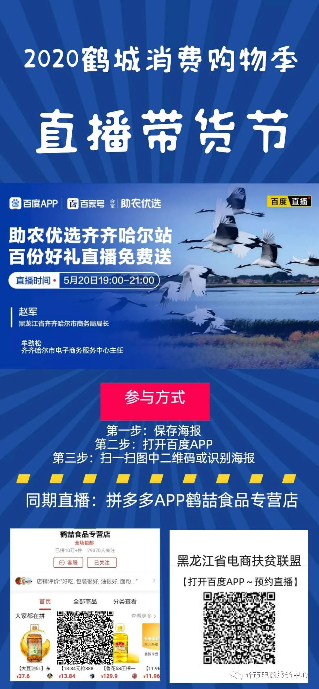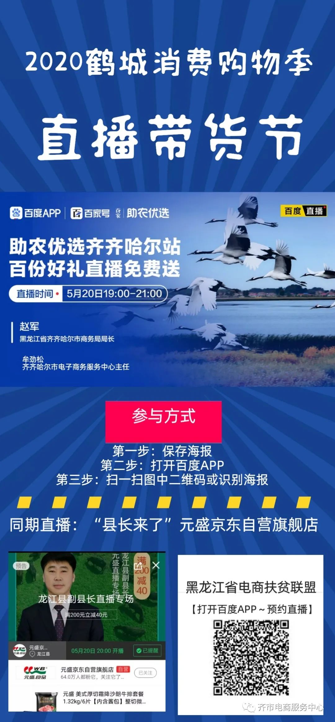 5月20日,齐齐哈尔市商务局局长赵军将做客直播间,通过直播带货推荐,为家乡农特产品代言,带大家认识不一样的“鹤城好网货”。齐齐哈尔市电商服务中心主任牟劲松还将详细为大家介绍鹤城好网货。