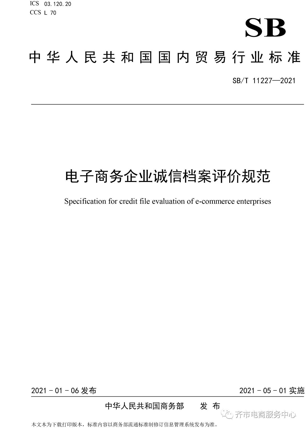《电子商务企业诚信档案评价规范》(SB/T 11227—2021)行业标准日前经商务部公告,于2021年5月1日正式实施。