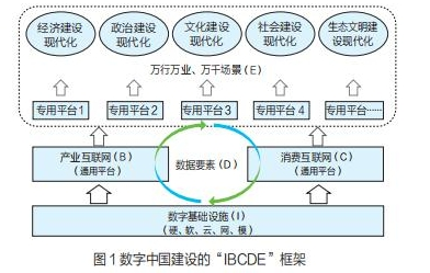 文章提出,“IBCDE”体系可作为数字中国建设的可行方案之一。数字经济分析框架由“IBCDE”五部分组成,即数字基础设施(Infrastructure)、产业互联网(To B,Business/Industrial internet)、消费互联网(To C,Consumer internet)、数据要素(Data factor)以及数字技术赋能万千场景(Empowering)。该方案的内部逻辑可概括为:以数字基础设施(I)为发展基石,由数据要素(D)为第一要素驱动力量,衍生出消费互联网(C)和产业互联网(B)两大组织生态,推动产业数字化发展、赋能万千场景(E),为推动中国式现代化打下坚实基础。数字中国建设的“IBCDE”框架是在安全高效利用数据要素的基础上搭建起“通用能力+专业能力”的生态互补关系,最终赋能万行万业。