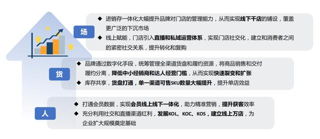 从线上看,零售有机体将商品销售和交付履约主体分离,降低中小经销商和达人经营门槛,使品牌能充分利用社交和直播渠道红利,发展关键领袖、关键意见消费者和关键意见销售,建立线上万店销售、品牌统筹履约的交易模式,为企业扩大规模奠定基础。从线下看,通过库存共享,货盘打通,品牌可实现全渠道进销存一体化,单一渠道可售SKU数量大幅提升,提升单店效益。另外,进销存一体化大幅提升品牌对门店的管理能力,从而实现线下千店的铺设,覆盖更广泛的下沉增量市场。从会员看,全域会员数据打通,品牌营销能力得到大幅提升,配合全渠道下单,跨渠道履约,品牌能随时响应消费者购买诉求,抓住消费者稍纵即逝的购买欲望,实现高效转化。