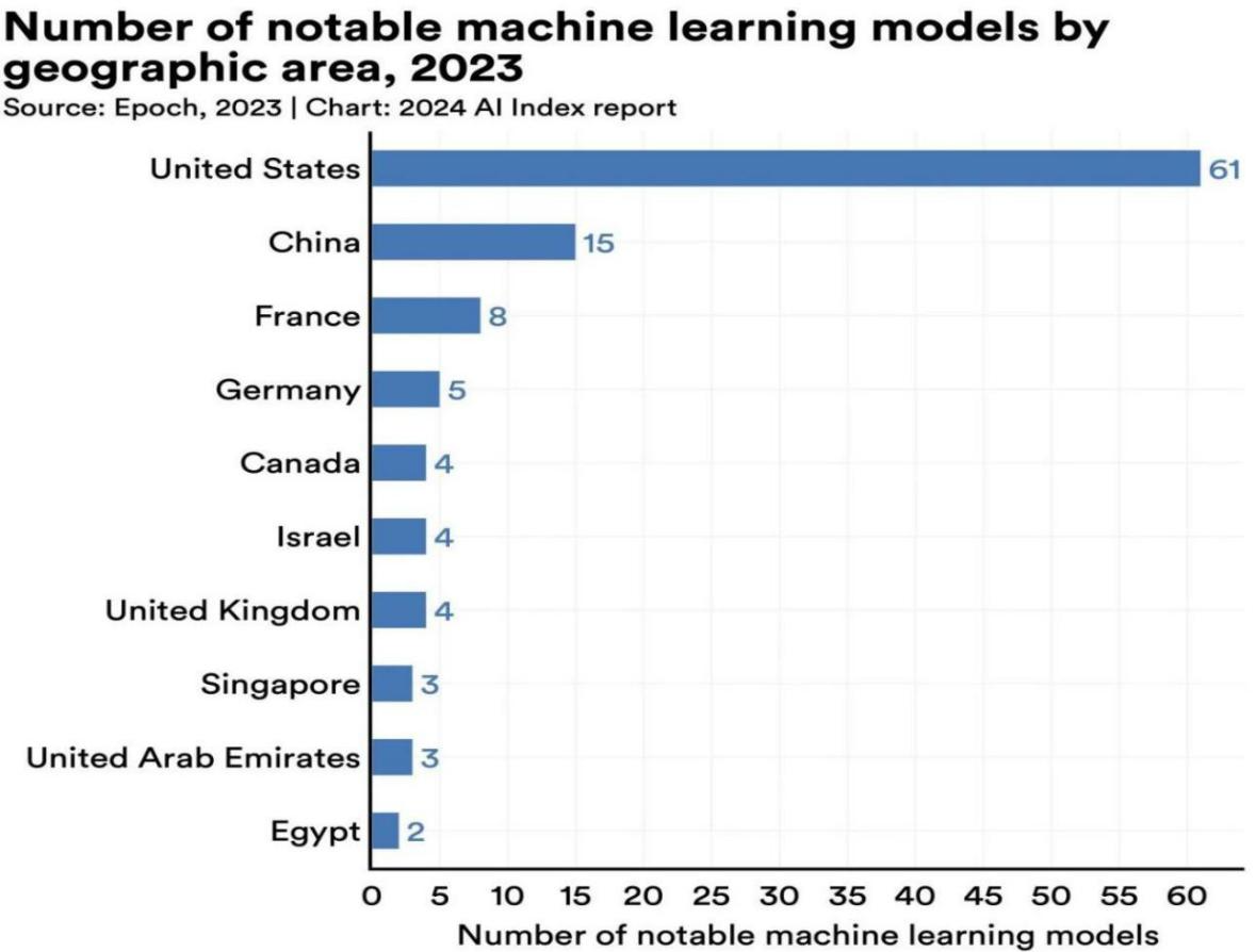 四是美国领先于中国、欧盟和英国,成为顶级人工智能模型的主要来源国。2023年,全球109个知名人工智能模型中,61个自美国,超过欧盟(21个)、中国(15个)和英国(4个)。