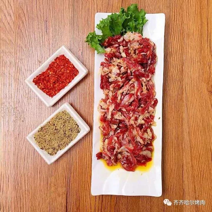 齐齐哈尔被称为“烤肉之城”,每一个齐齐哈尔的家庭在制作烤肉时都有自己的独特秘方。牛麻豆齐齐哈尔烤肉以牛肉为主,选择牛的上脑、肋扇、胸口等口感鲜嫩、有嚼劲部位,将牛肉切成大小4-5厘米,厚度2毫米左右,介于块和片的形状有利于锁住肉汁,方便烤制。