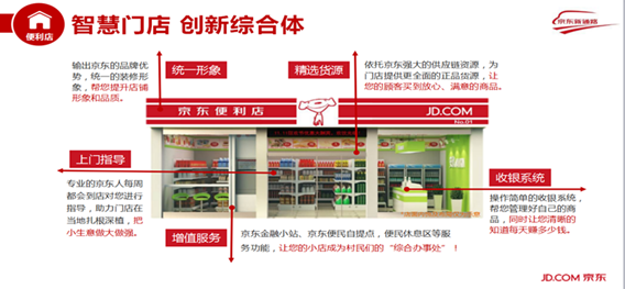 京东商城新通路事业部正式成立于2015年12月份,依托智慧门店管理系统、行者动销平台和慧眼大数据系统,紧密关联,结合京东强大的供应链网络和京东新通路自建的地勤团队,真正实现品牌商、终端门店和消费者三者之间的商流、物流、信息流链路闭环,透明开放地对接品牌厂商,升级百万智慧门店,以技术引领未来零售业的发展。未来五年将在全开始便利店100万家,其中一半在农村,京东便利店并非传统意义上的便利店形态,而是京东线下版本的创新型智慧门店。