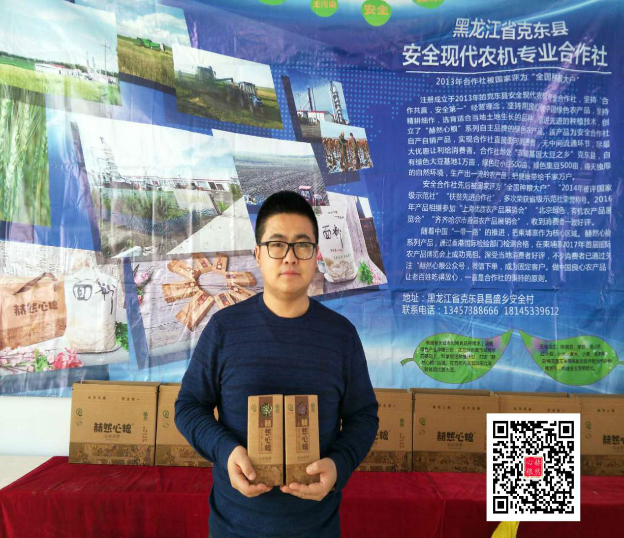 【粒粒皆幸苦,颗颗建乡情】赫永东出生在克东县昌盛乡一个普通的农民家庭, 2007年毕业于湖南南华大学并定居广州。2013年秋天,赫永东不顾家人反对,毅然回到家乡,经营安全现代农机专业合作社,如今成为了合作社的理事长。他坚持为广大农民牟利并提出“合作共赢,安全第一"经营理念,用良心做赫然心粮绿色农产品,走自产自销路线,将农产品利润最大化为目标而努力奋斗。该合作社获得了“全国种粮大户”的大奖、被评为全国优秀示范合作社。