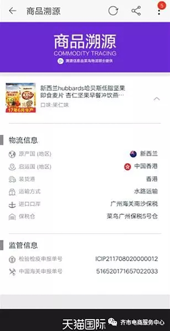 “当这些商品从海外运往中国时,各项物流数据便已经开始‘上链’。”唐韧介绍,“这些数据包括了商品的原产国、启运国、装货港、运输方式、进口口岸、保税仓检验检疫单号、海关申报单号等等,这些由各方提供的信息都将成为一个组合,供消费者查证。”在手机淘宝的物流详情页面,消费者可通过底端的“查看商品物流溯源信息”按钮进入商品溯源页面,即可查看购买商品的全部溯源信息。