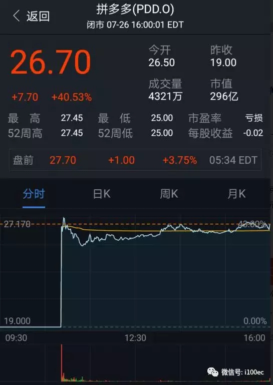 截至美股收盘,拼多多取得了上市后首张优异的成绩单,报26.7美元每股,上涨幅度高达40.53%,当日开盘值为26.5美元,最高值为27.45美元,最低值为25美元,成交量为4321万美元,总市值更是达到了296亿美元。