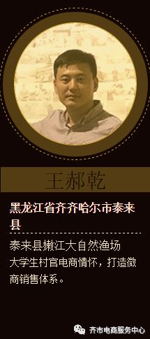 王郝乾,是一位普通的农民大学生,2007年毕业于中国防卫科技学院国际经济与贸易本科专业经济学学士学位,标准的80后。2011年10月,他看重了泰来优越的创业环境,来到泰来创业,成立了黑龙江省泰来县嫩江大自然渔场,创办了嫩江壹号大闸蟹生态示范基地,注册自有品牌“嫩江壹号”、“光华壹号”两个水产类商标,自行设计精美产品包装,其中活鱼包装桶为国家专利产品。当地人都送他个昵称“电商一号”。
